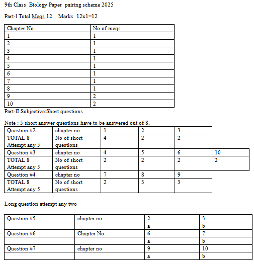 9th Class Biology Paper Pairing Scheme 2025 & 2026 for Easy Preparation
