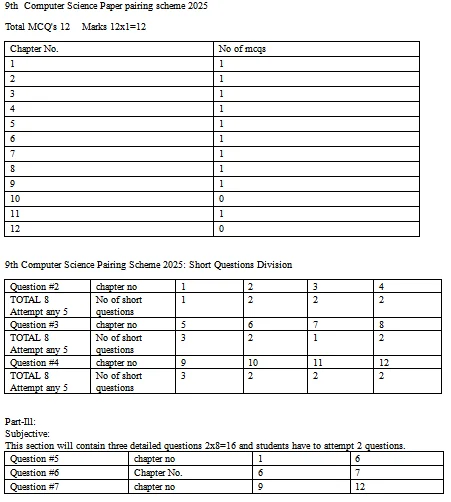 9th Class Computer Science Paper Pairing Scheme 2025 & 2026 Chapter Wise Marks Distribution